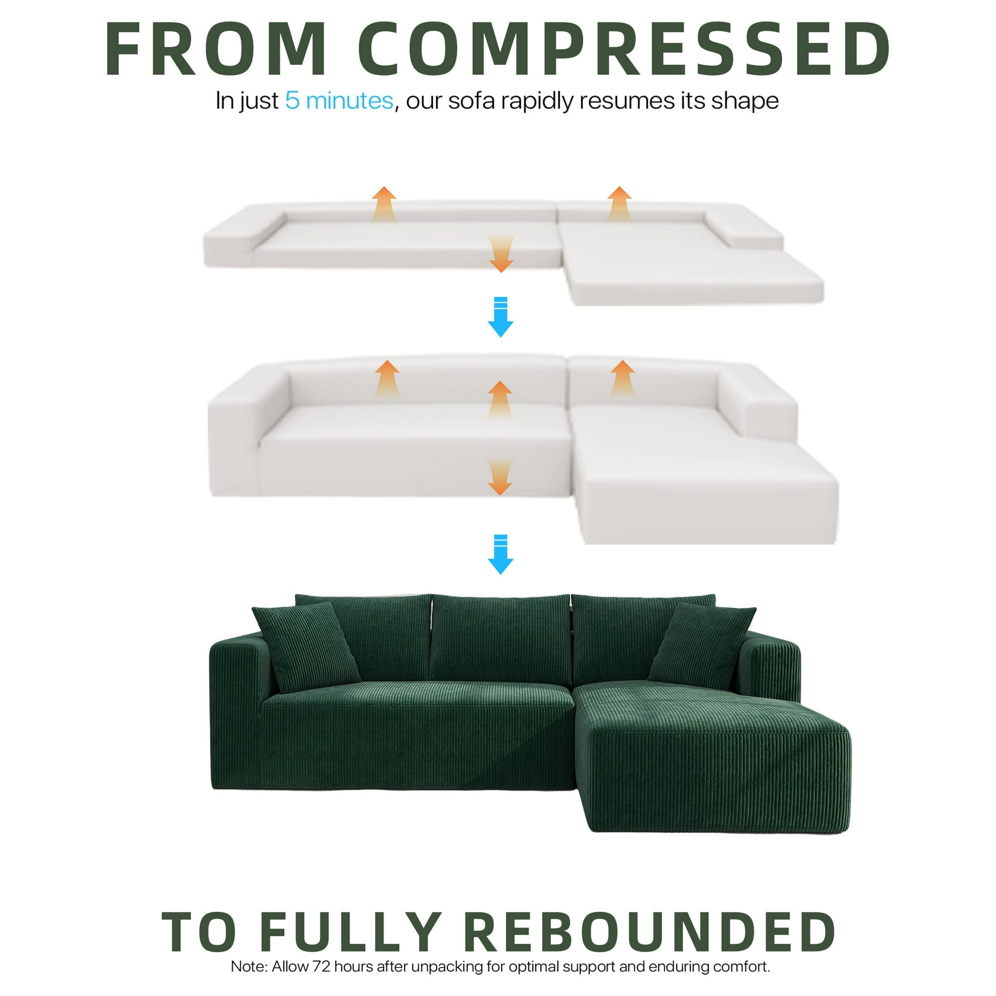 Mattress-Grade Compression Technology: The sectional sofa couch uses mattress-grade compression technology for easy transport and setup. While some minor wrinkles may remain after expansion, the corduroy fabric recovers quickly to give a smooth appearance. For faster results, you can lightly iron the fabric to help reduce any remaining wrinkles. Full expansion may take 24-72 hours, but the living room couch is ready to use immediately.
