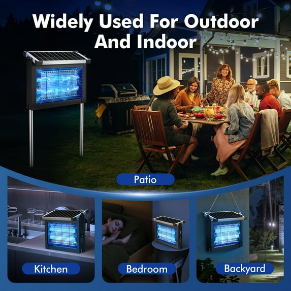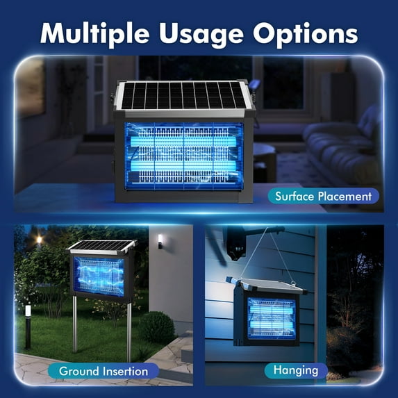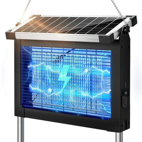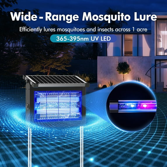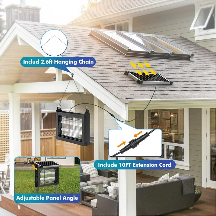 Switch between AUTO (activates at dusk) or 24/7 ON mode. Includes a hanging chain, two ground stakes, and a 10ft solar panel extension cable. You can mount, hang, or stake this portable mosquito killer lamp anywhere!