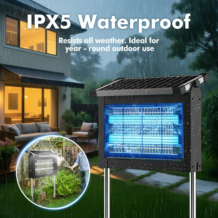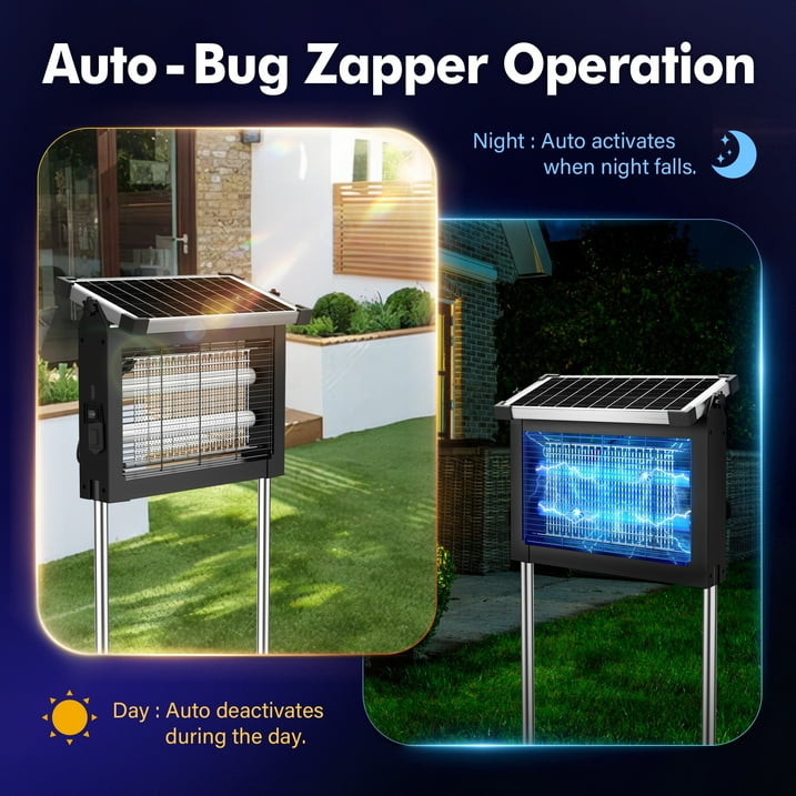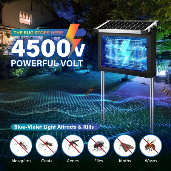 Enjoy every delightful evening with the Aenkyo Outdoor Solar Bug Zapper! This high-performance mosquito killer lamp delivers powerful insect control for up to 1 acre, eliminating mosquitoes, flies, gnats, and wasps with 4500V instant zap technology. Dual 365-395nm LED bulbs attract pests effectively to the electric grid, while dual charging (solar/USB-C) offers 12 hours of cordless operation. Set it to AUTO for dusk activation or manual 24/7 mode. Designed for versatile placement with stakes, chains, or freestanding use. This device is engineered with a safety mesh to protect kids and pets; it requires no chemicals. The IPX5 waterproof build ensures durability in all weather, and washable grids simplify maintenance. Ideal for patios, gardens, camping, and pools.