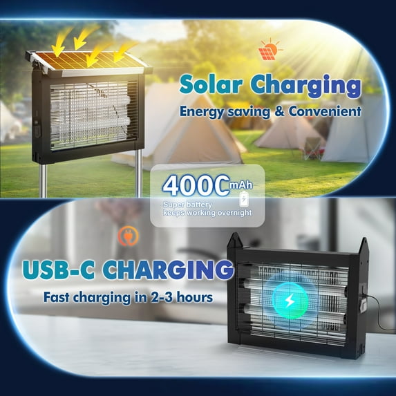 Our solar bug zapper features a 10W monocrystalline solar panel and a 4,000mAh battery for sustainable power. You can fully recharge the solar via sunlight or USB-C in just 3-4 hours. Enjoy up to 12 hours of continuous operation, making it perfect for camping, RV trips, and backyard use.