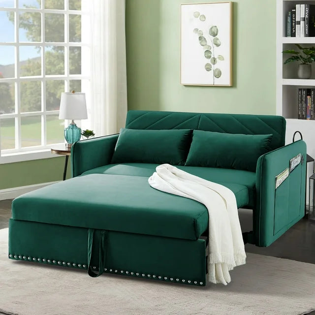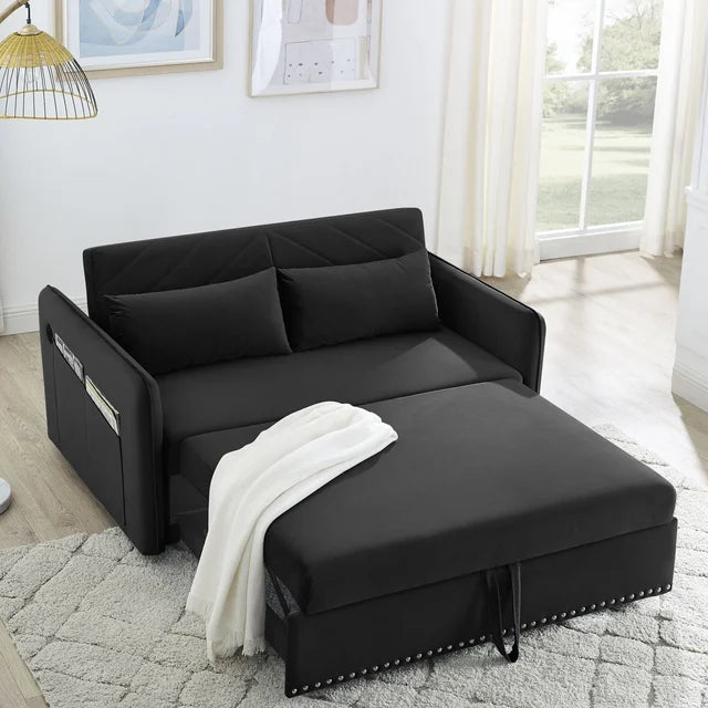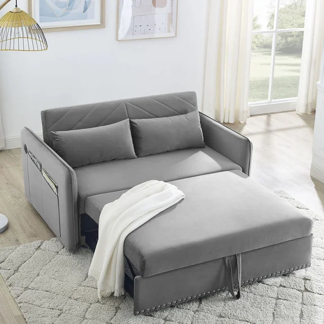 DEALTOPS AK-FS02-002 55-inch Wide Velvet Sofa Bed is the epitome of contemporary style and functionality for your living room, bedroom, or home office. Crafted with durable iron frame hinges and a sturdy wooden frame, this sofa bed is built to last. Upholstered in premium velvet, it exudes elegance, comfort, and resilience against wrinkles. With 3 adjustable backrest levels, you can find your perfect lounging position, while two large side pockets effortlessly store your TV remote, phone, magazines, keys, and more. What’s more, this sofa has a USB charging port so you never have to worry about running out of power. Elevate your space with the DEALTOPS Velvet Sofa Bed, a luxurious and comfortable sleeping solution, all while adding a touch of modern sophistication to your home décor. Ideal for those seeking a stylish and versatile sofa bed option.