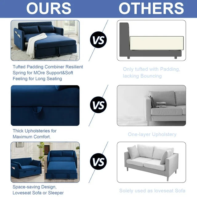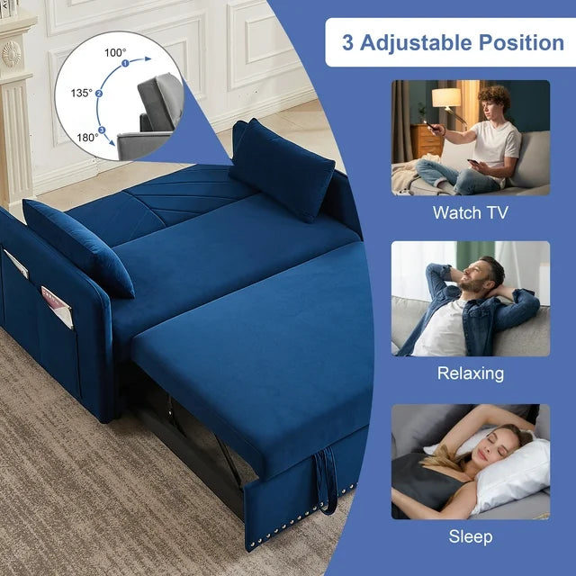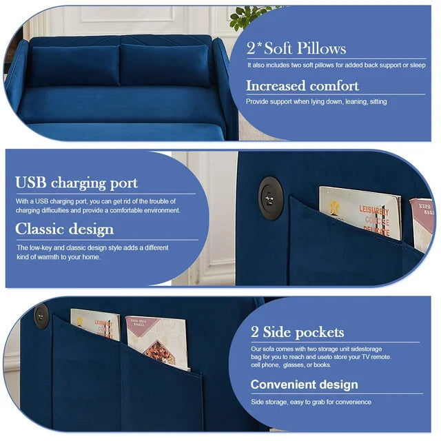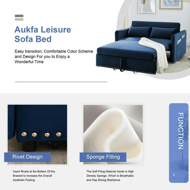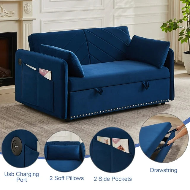 AENKYO 3 in 1 Convertible Sofa Bed, 55" Velvet Loveseat Sleeper with 2 Pillows & USB Port, Blue