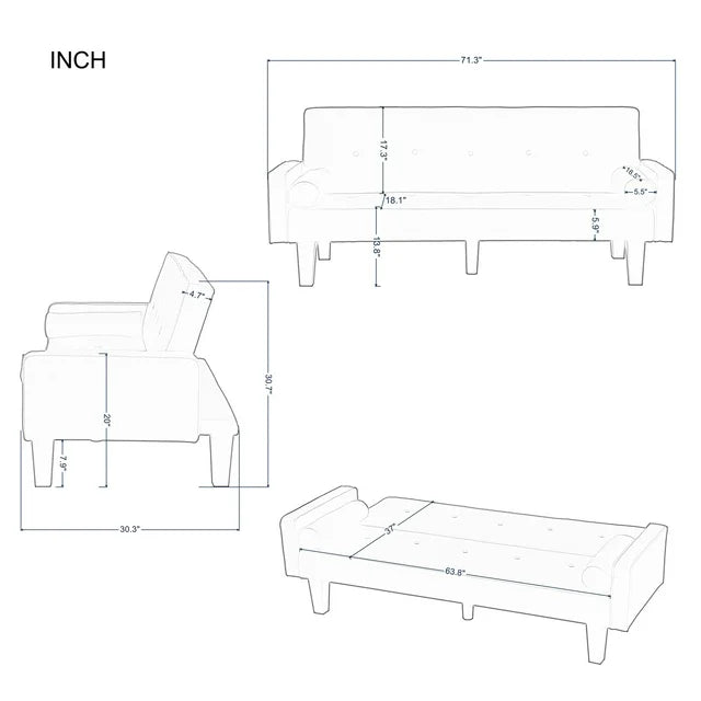- 3-IN-1 DESIGN FUTON - The space-saving futon sofa bed features a folding contraption to lock the back at 105 degrees for reading/TV or 140 degrees for lounging and lay down the back as a 71" long by 37" wide twin-size bed.