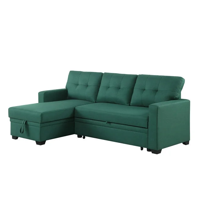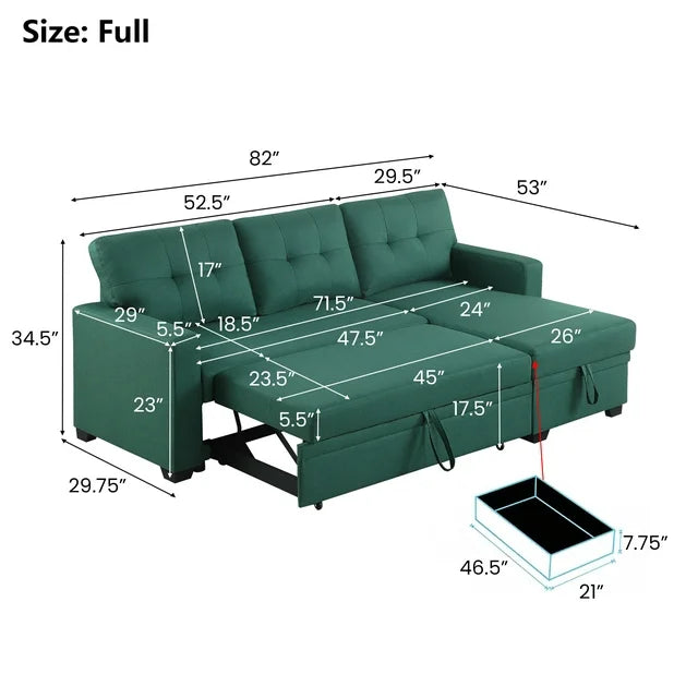 The DEALTOPS AK-FS02-035 2 in 1 pull out sofa bed with storage chaise is a modern, stylish choice with neutral colors. the sectional sleeper sofa includes a reversible chaise that helps with arranging your space in any way that you want and provides storage space to store your blanket or extra pillows, keeping your living space neat and tidy. The easy-to-lift design allows for quick access to your belongings. You can convert the sofa into a bed by pulling out the roll-out bed from underneath the cushion and converting it into a full-size bed. upholstered in soft linen fabric that’s both stylish and easy to care for. The cozy tufted back provides optimal support and relaxation, making it an ideal spot for lounging, reading, or enjoying your favorite movies and TV shows. Whether you live in a compact apartment, have a small guest room, or simply need a multifunctional piece of furniture, our pull out bed with storage chaise is designed to meet your needs. It's perfect for everyday use or as an extra sleeping option for guests.