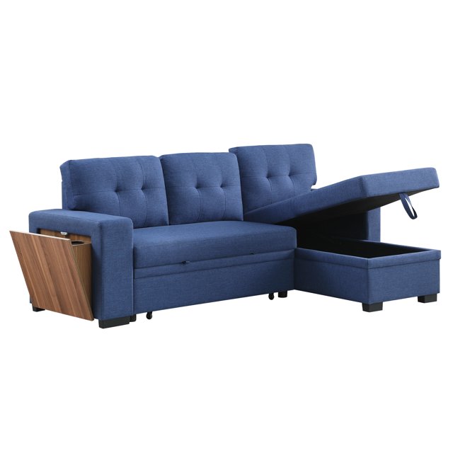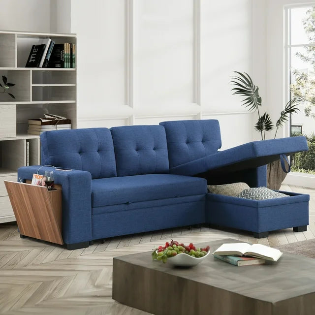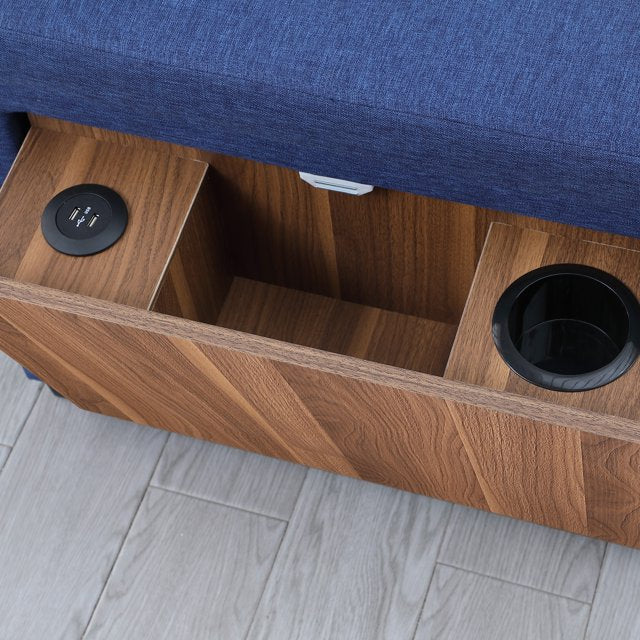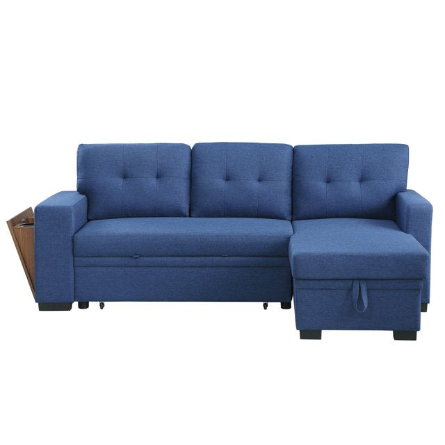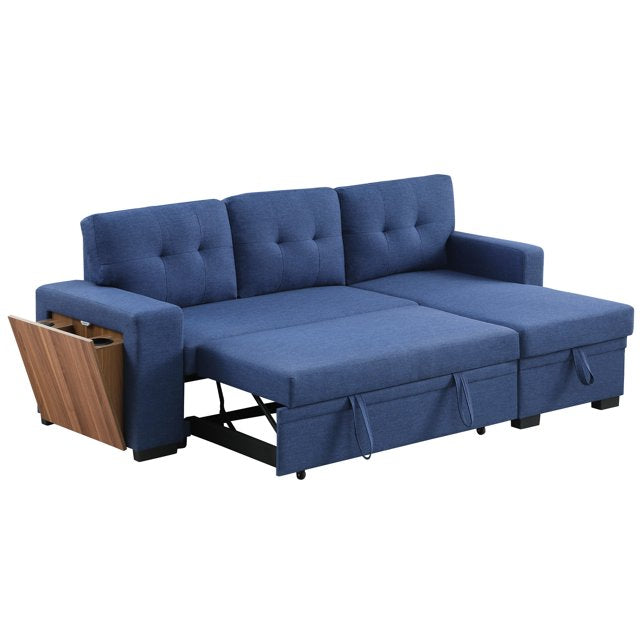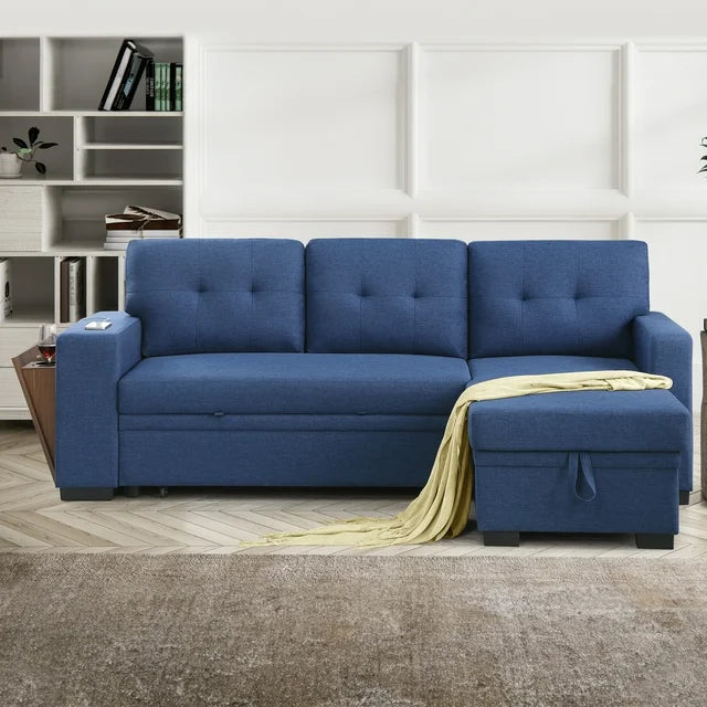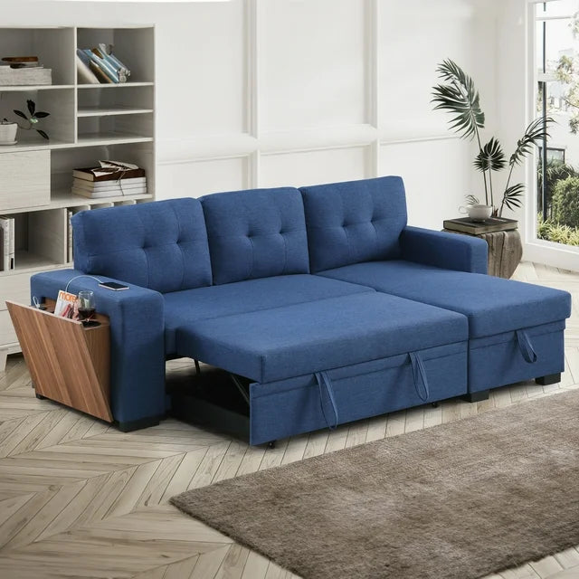 AENKYO 92" Sofa Bed, Couch with Side USB &Cupholder Console for Living Room, Pull Out Sleeper Sofa, Linen, Blue