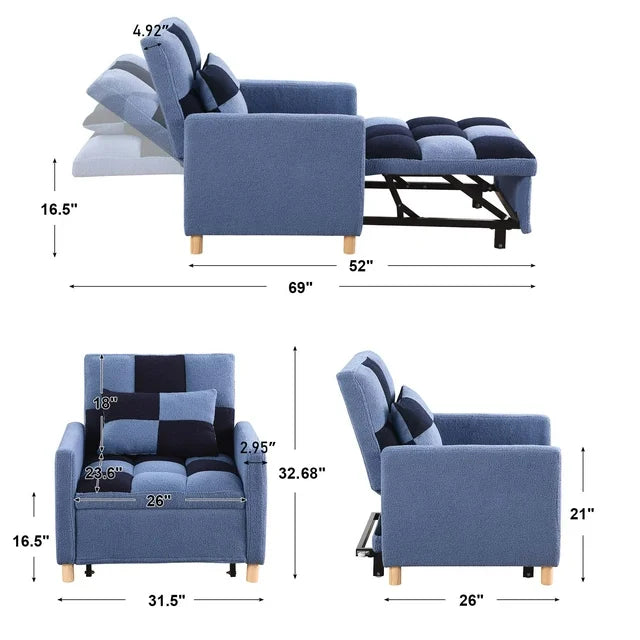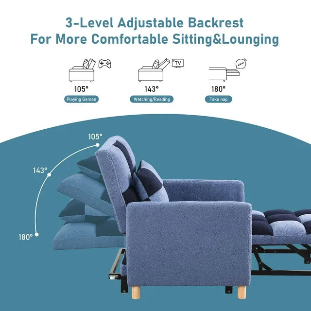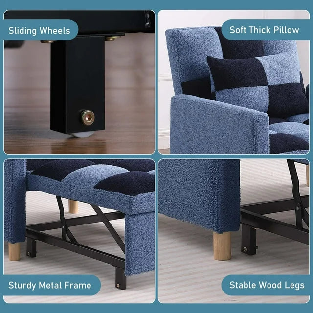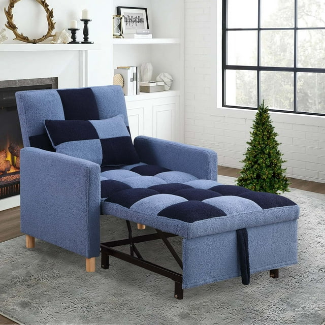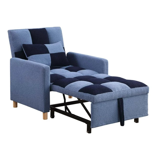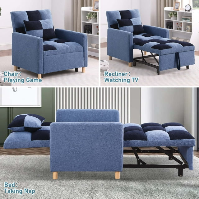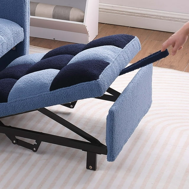 AENKYO Convertible Sleeper Chair Bed, Patchwork Pull Out Sofa Chair with Adjustable Backrest, Teddy Fabric - Blue/Navy