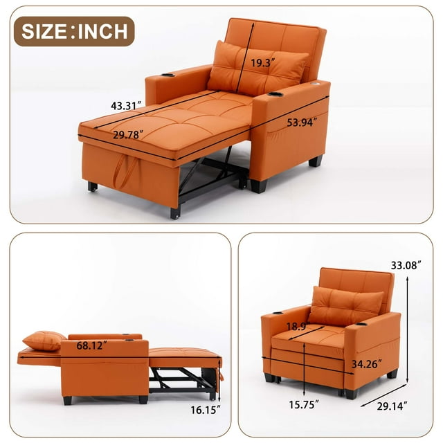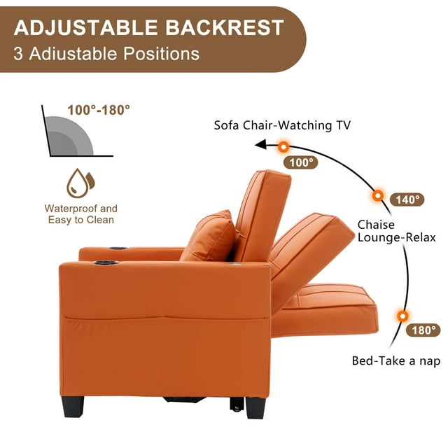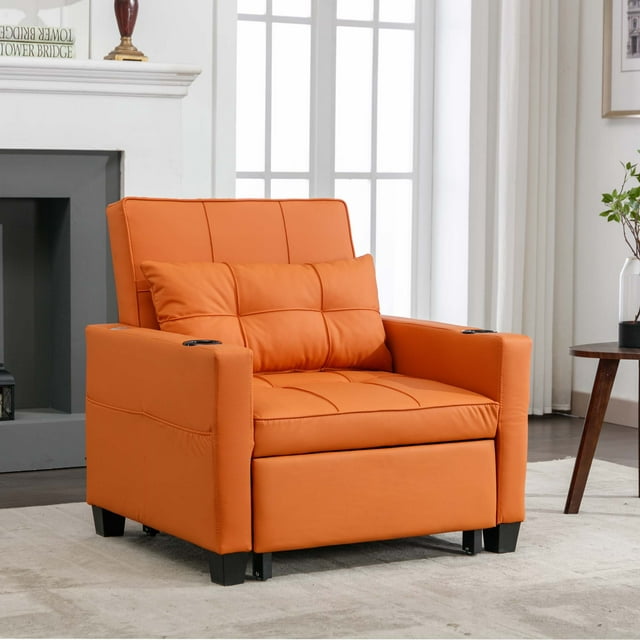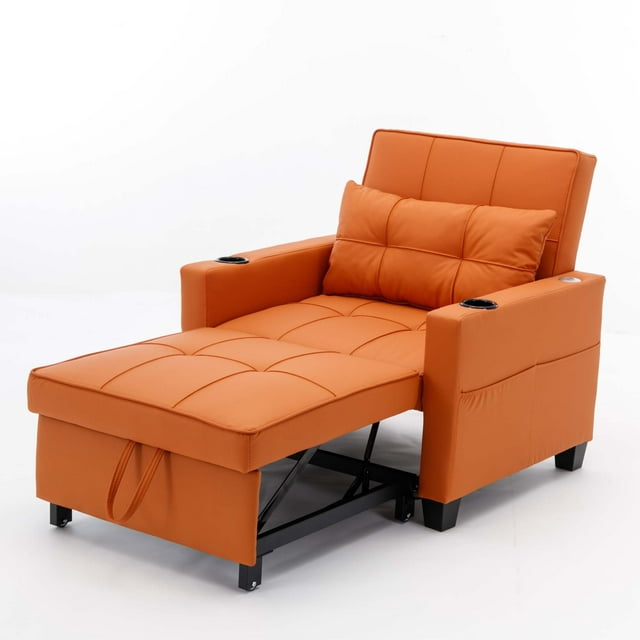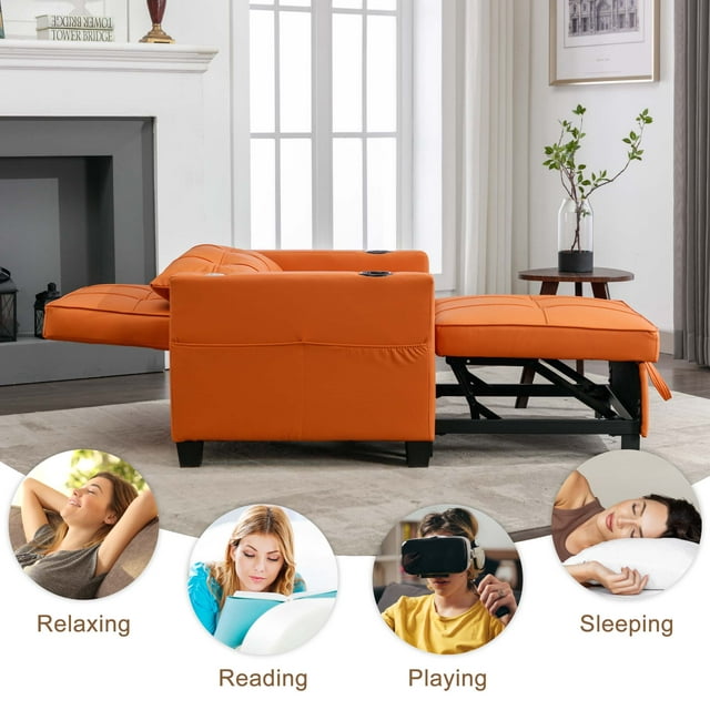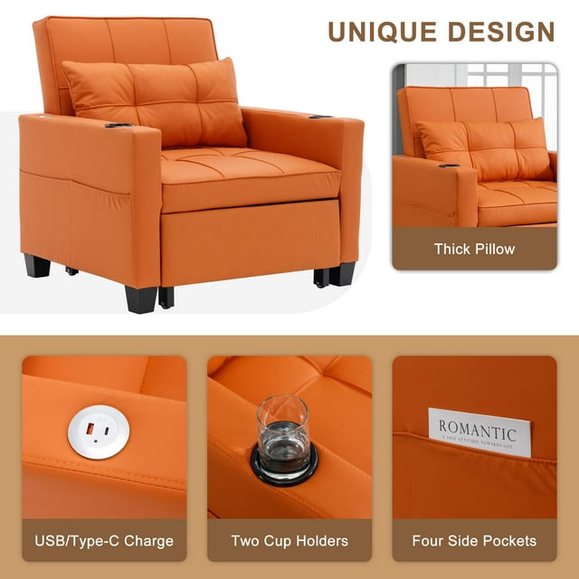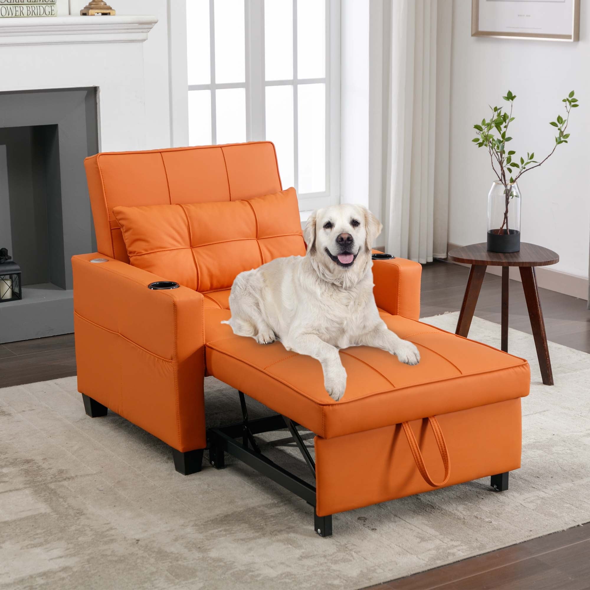 AENKYO Convertible Sleeper Sofa Chair, Futon Chair Bed with USB Ports and Cup Holders for Living Room - Orange
