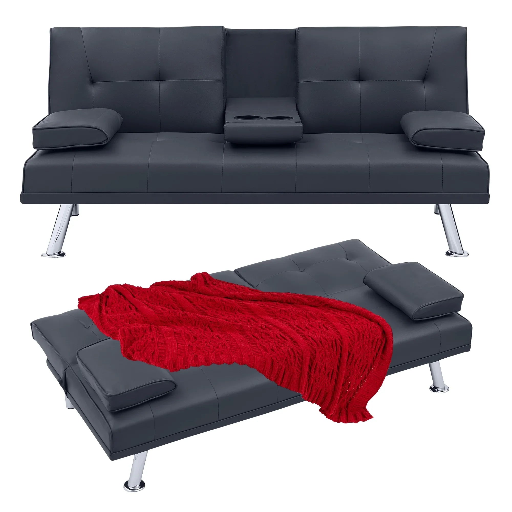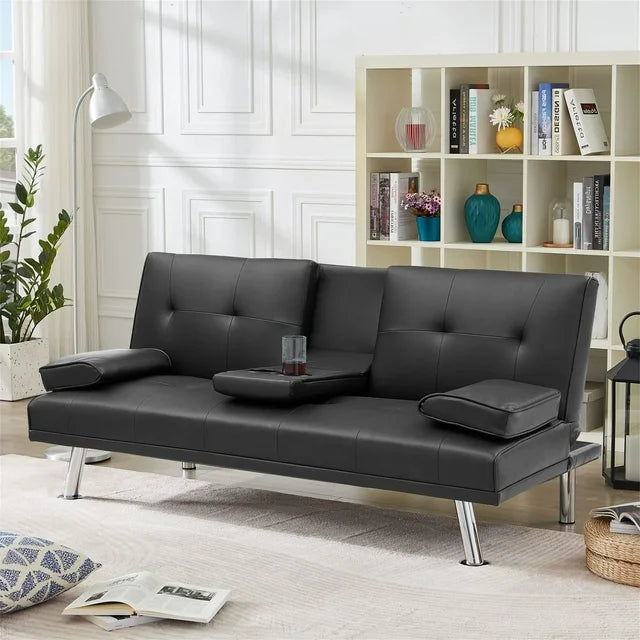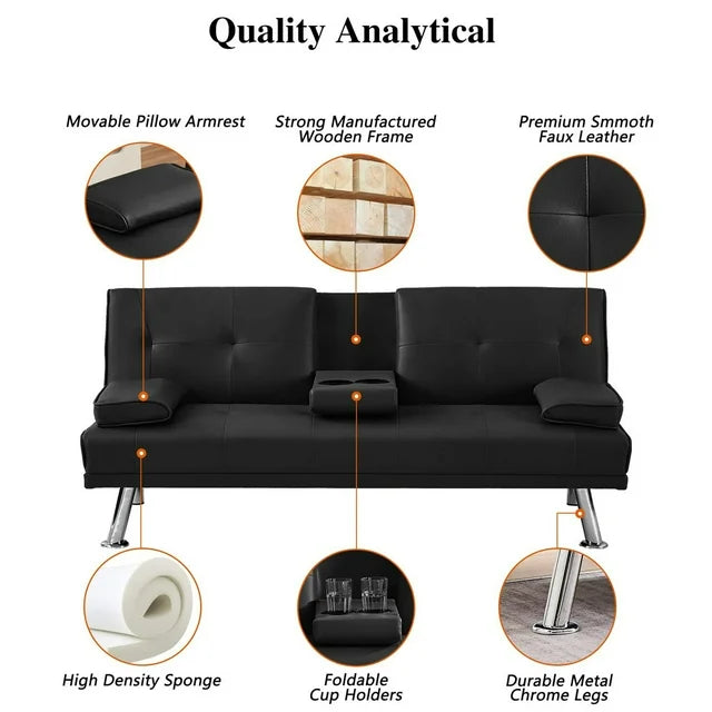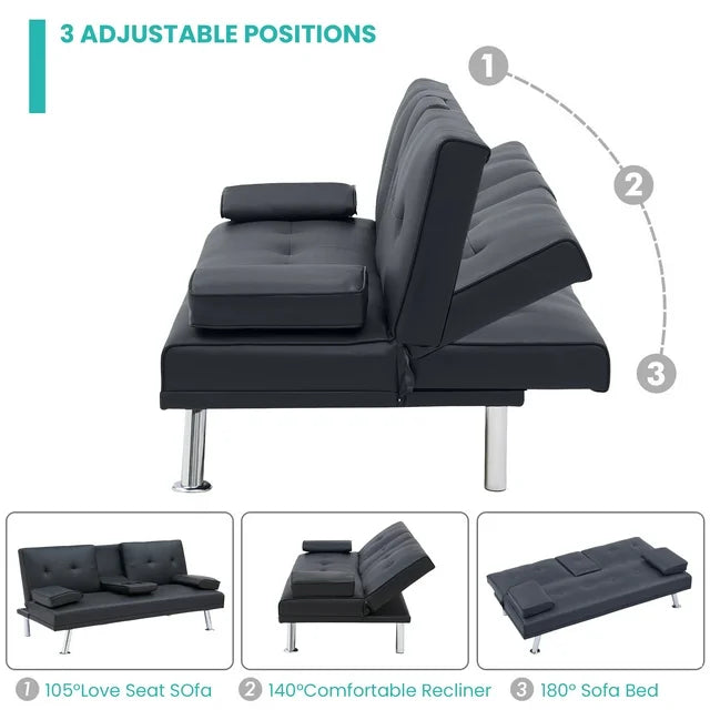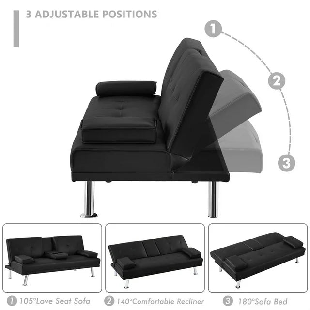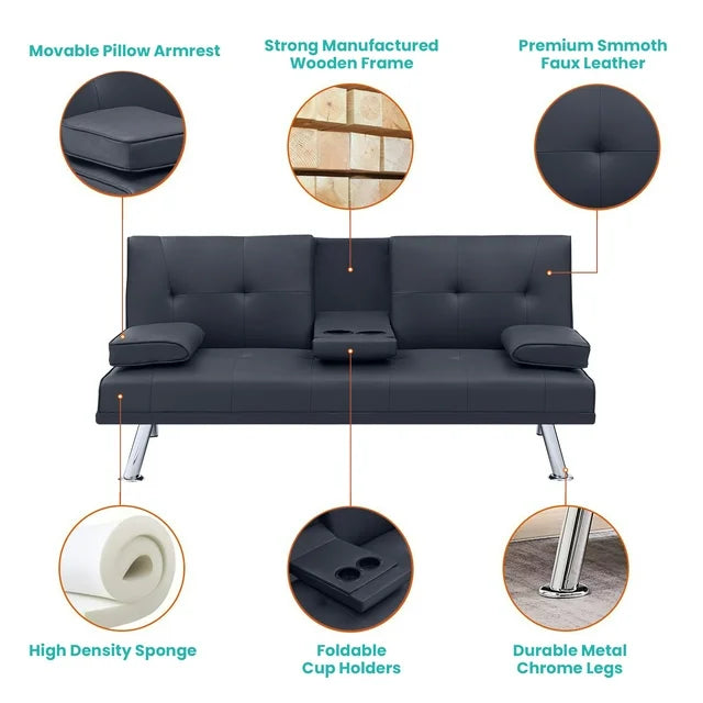 AENKYO Leather Futon Convertible Sofa Bed, Loveseat Couch for Home Office, 2 Cup Holders, Black